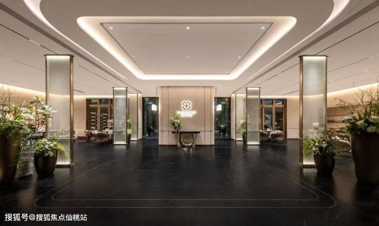 项目从入口便彰显高端质感:中轴对称的门廊式大门,采用白+香槟金经典色系,搭配罗汉松与石材景墙,营造出豪宅级的酒店式仪式感,一眼便能感受到社区的高端定位。