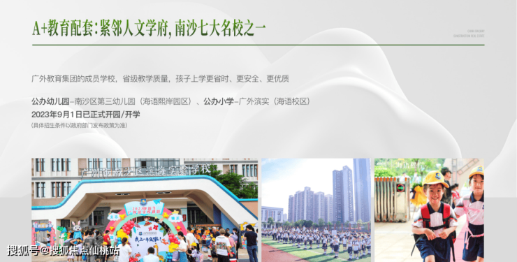 公办幼儿园-南沙区第三幼儿园(海语熙岸园区)、公办小学-广外滨实(海语校区)2023年9月1日已正式开园/开学(具体招生条件以政府部门发布政策为准)。