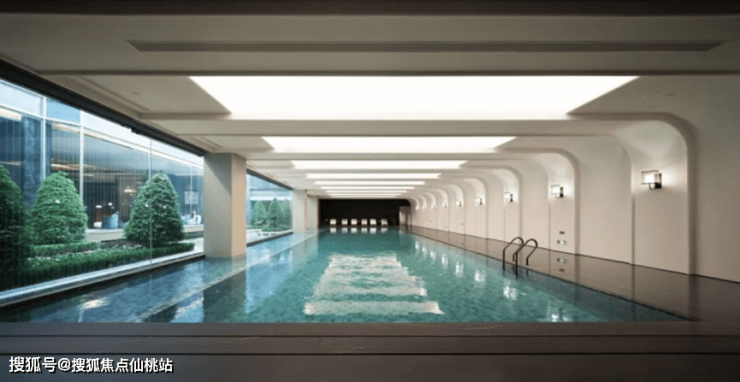 归家大堂正面的玻璃幕墙外是项目的下沉庭院,庭院后方便是片区内唯一的恒温游泳池会所。
