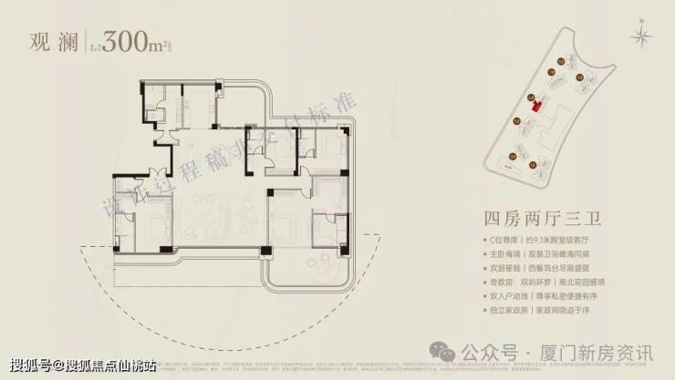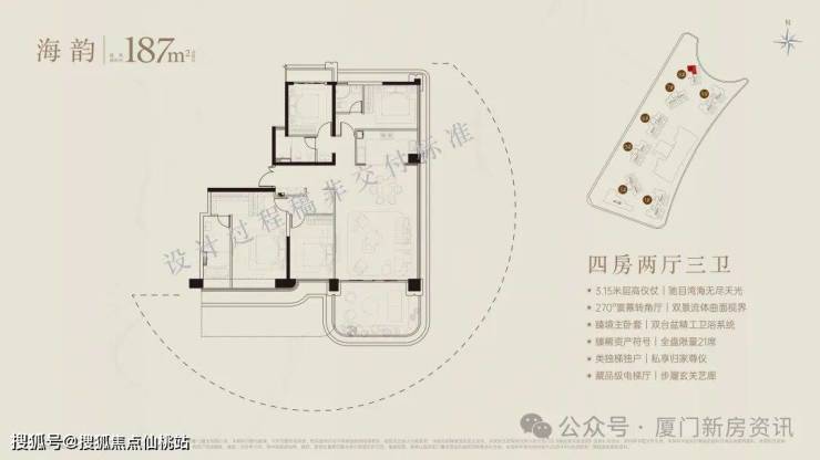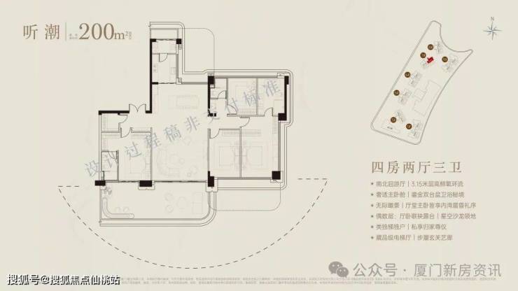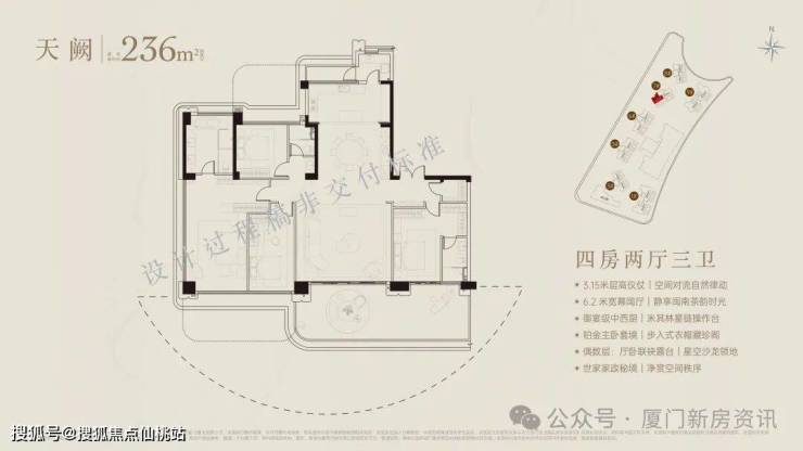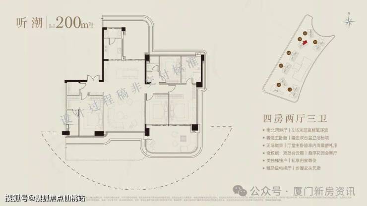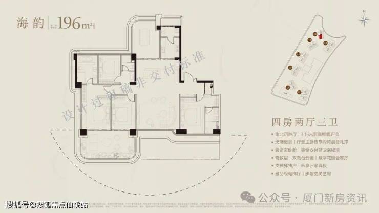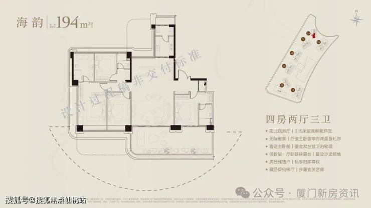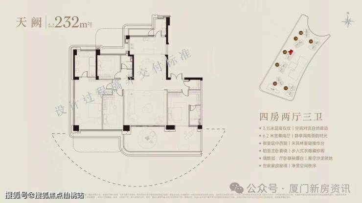 超90米、福建最长海阙之门,琉璃微光,辉映奢雅,厦门首创屋顶内外双无边际泳池,厦门首创三会所顶序豪宅(下沉式会所+架空层泛会所+大门屋顶会所),于厦门首发七衡系统科技配置(衡温、衡湿、衡氧、衡净、衡洁、衡静、衡光)实现低碳环保的居住品质。