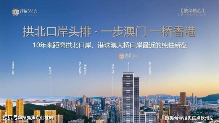 观宸246,位居拱北口岸头排,珠澳同城核心板块,城市中心+口岸物业双极加持,近10年来距离拱北口岸、港珠澳大桥口岸最近的纯住新盘,左手澳门世界级休闲娱乐配套,右手拱北城市烟火生活,坐享醇熟配套,畅享港珠澳三城无界生活。