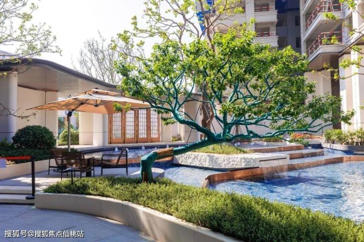 从主入口的「水月芳屿」静雅水景会客厅启程,这里以近300㎡水景为核心,构筑一方约800㎡的“园中之园”。设计灵感汲取自岭南名园“余荫山房”,入口两侧的红果冬青如躬身迎宾,归家仪式感自此而生。
