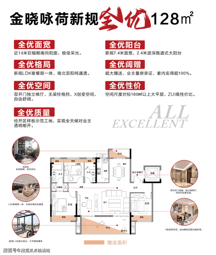 以洋房128㎡户型为例,全户型面宽近 14米,客厅阳台 7.4 米,完全可以对标市场上150㎡大平层尺度。客阳区域采用无梁柱设计、LDK 客餐厨阳一体贯通,南北双阳台、通透性拉满。实际使用率超 100%。私密性也更强,独立私家电梯厅、双开门电梯,互不干扰,保障了居民的隐私。