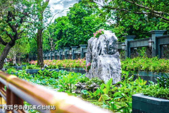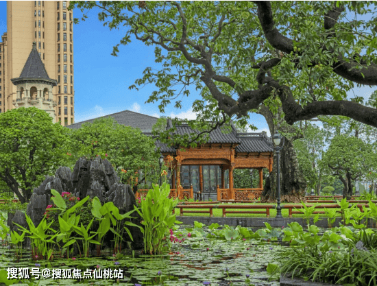 2)大型亲水荷塘 以水为核心,以约 200 多棵高大乔木、约 29 组富贵绿石及英石为主要景观,大量荷花等水生植物作为衬托,园林和建筑融合得美轮美奂