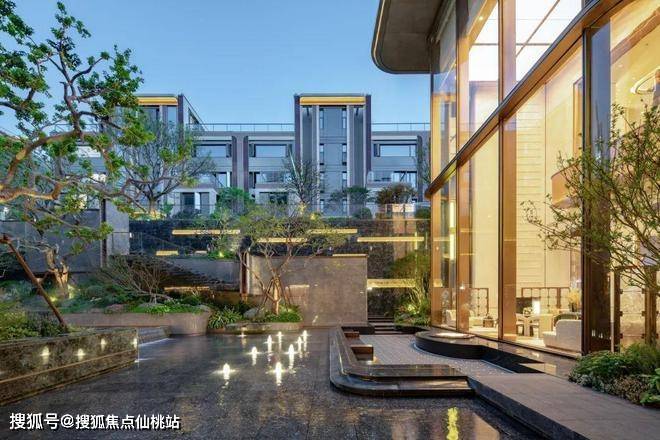 整个门厅以精致的陶瓷质感与石材相互交织。进口约百年罗汉松,树高有4.5米,形成天然的“绿色穹顶”,搭配巴西进口的宇宙金奢石水景,自带金白相间的天然纹理,像是星河倾泻,添了几分柔情。
