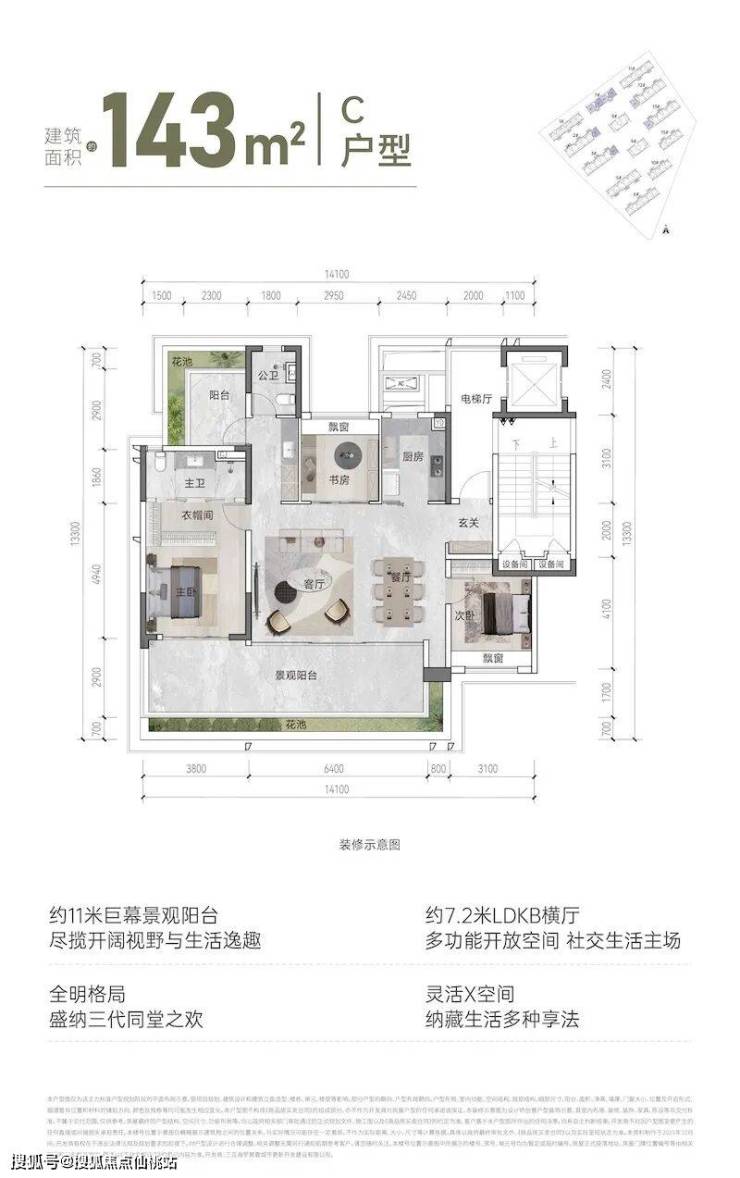 约11米巨幕景观阳台与约7.2米LDKB横厅形成呼应,尽揽开阔视野与生活逸趣;全明格局搭配多功能开放空间,成为社交生活主场;灵活X空间设计可满足三代同堂的居住需求,或改造为书房、茶室,盛纳家庭欢聚时光;独立电梯厅与完善的收纳系统,提升居住的便利性与舒适度。