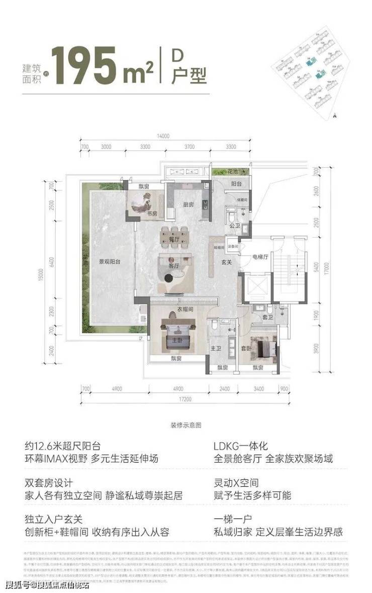 作为项目的高端户型,约12.6米超尺阳台堪称“观景王者”,环幕IMAX视野打造多元生活延伸场;LDKG一体化全景舱客厅是全家族欢聚的核心场域;双套房设计让家人各有独立空间,静谧私域彰显尊崇起居;一梯一户配置+独立入户玄关,搭配创新柜+鞋帽间,出入从容有序;灵动X空间赋予生活更多可能,适合高端改善、多代同堂或追求极致旅居体验的人群。