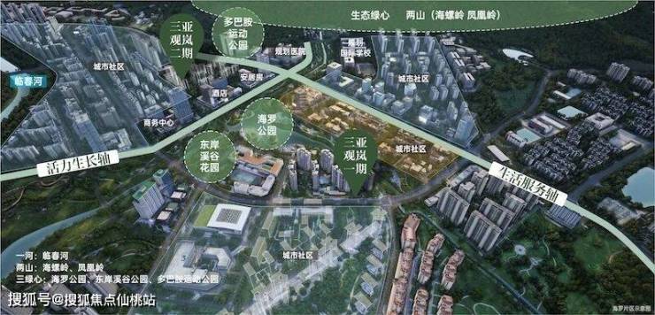 二:配套布局上,板块以“十字双轴”串联全维资源:生活服务轴打造5-15分钟步行生活圈,覆盖日常、健康与成长需求;活力生长轴构建“事业-社交-生态”闭环。从具体生活圈来看,400米范围内可享凤凰岭公园、临春河景观带的舒适氛围;1.5公里内汇聚三亚七小海罗校区、巴蜀中学三亚校区双学区,及三亚妇幼保健院等优质医疗资源;3公里内则能触及大悦城、海旅免税城、三亚千古情、市体育中心等城市核心配套,实现“离尘不离城”的理想生活。