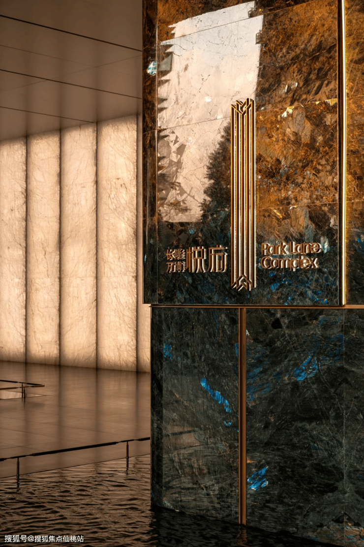 入口门庭两侧缀以珍贵、稀缺的蓝翡翠奢石,璀璨夺目又凸显项目的奢华气质,使得“悦系”标识更有质地。