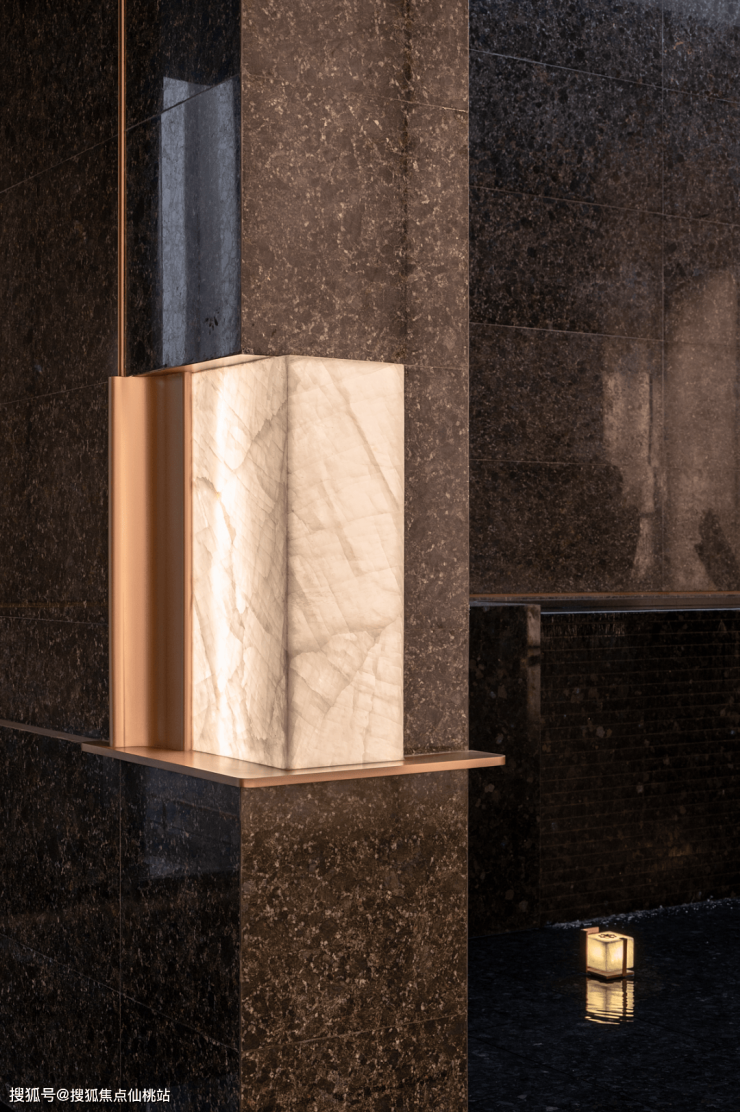 在威尼斯棕奢石打造的入户门墙上,一面自带温润灯光的悦系专属标识入户门牌,完成业主身份归属的最终确认。