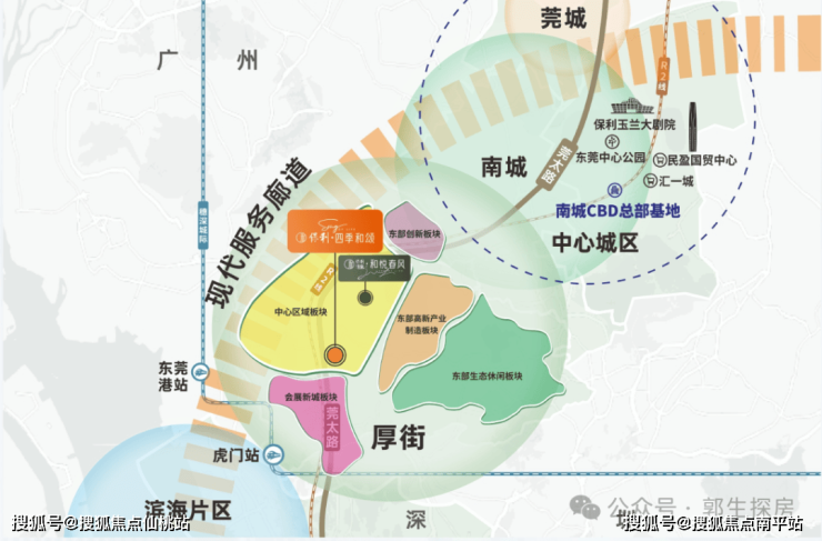 保利·四季和颂所在的厚街CBD中央商务区,总面积约为150公顷,锚定科创服务功能发展定位,打造“多元智汇绿谷、立体复合新城”的新兴城区,现已引进慕思企业总部、东莞农商银行等高新企业,打造省道沿线地标建筑,未来将以显赫实力成就东莞”门面担当。