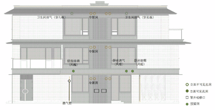 厨房通气口需外露,但传统风帽影响立面。我们在土建阶段预留孔洞,并外扣金属格栅,将其整合于首层腰线的金属挂板之内。同理,卫生间排气口藏于挑檐的内收线脚,冷媒洞则通过立面腔体进行遮蔽。