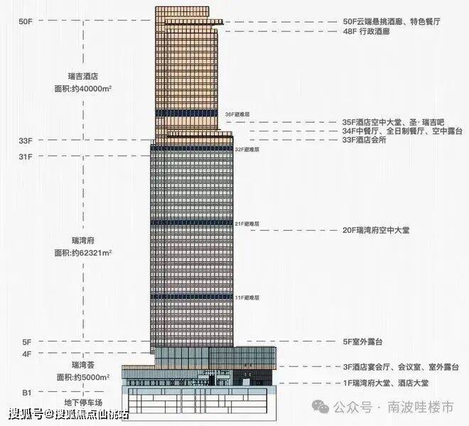 项目33-50F为瑞吉酒店,5-31F瑞湾府目前在售190-360㎡酒店式行政公馆,层高4.4米。