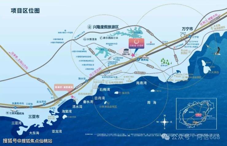 项目位于海南万宁环岛高速兴隆神州半岛互通西侧,距离神州高铁站2公里,项目西侧紧挨着大型商业综合体,王府井免税港,南边还有莲花村,生活出行都很方便。