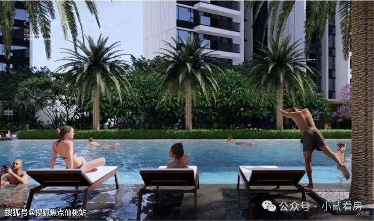度假泳池:融合公园化自然体验,打造阳光泳池,水景黑金沙铺装相映成趣,叠水景观潺潺,景观躺椅营造度假式体验