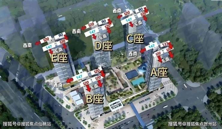 由1栋A、B、C、D、E五座及底层商业组成,配备有幼儿园、游泳池等。其中A、C、D座为43层,B、E座为41层,均为3梯4户的设计。