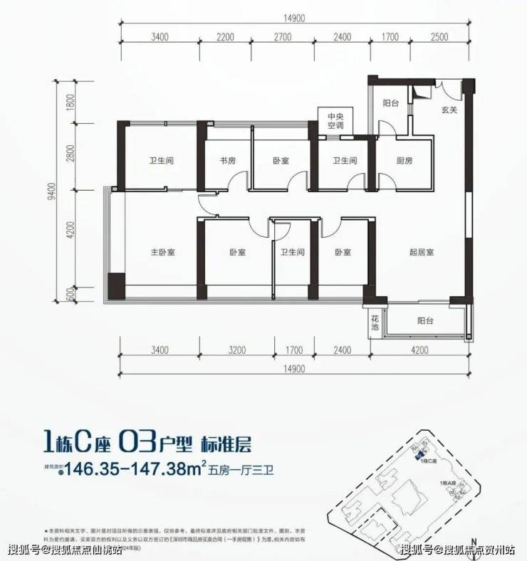 建面约147㎡5房2厅2卫,03户型位于C栋,西南朝向、传统竖厅格局、动静分区。