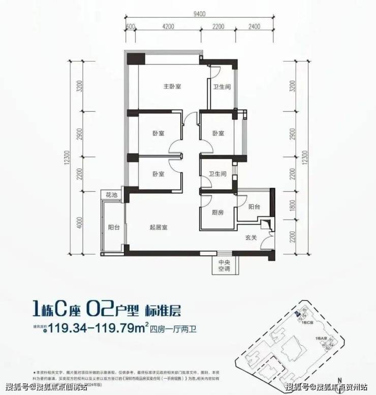 建面约120㎡4房2厅2卫,有02、03、04三种设计,其中04户型位于A、C座,02户型位于C座,03户型位于A座,该户型使用率约约85%(包含赠送面积)。