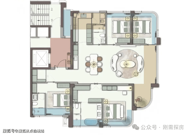 189平(端厅):四房两厅三卫,2T2,电梯没有合并,有一定私密性,但是高层略影响出行,有利有弊。