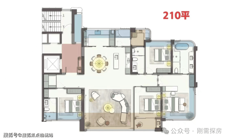 210平:四房两厅三卫,2T2,189平南厅的升级版,多了800库,客卫也不是暗卫,还多了一个保姆房+北向小阳台。