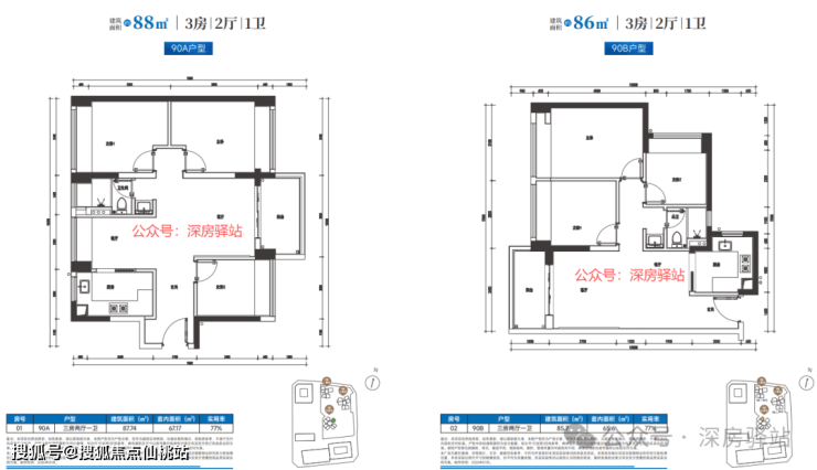 三房户型51套,建筑面积约86-88平方米。