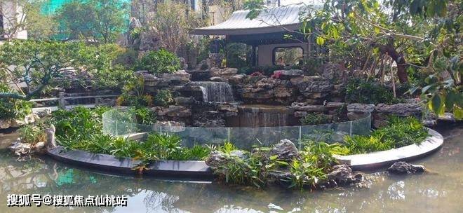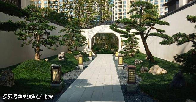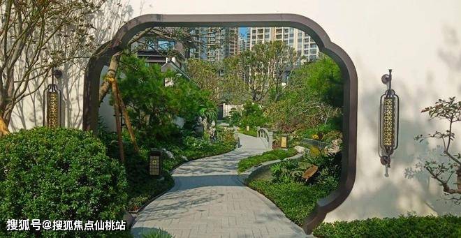 在中轴景观上,每穿过一个类似苏州园林月亮门的拱门,都会呈现一些不同的景致。例如以罗汉松为主题的“松里”,以小桥流水、睡莲游鱼为主要景观装饰的“泛菱”等。
