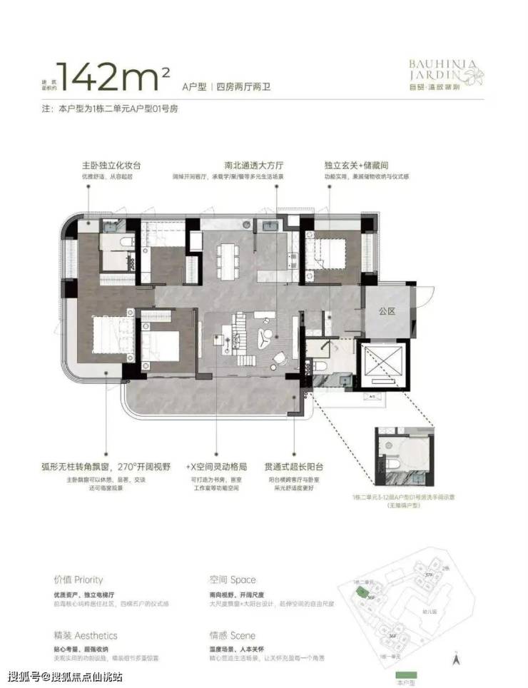 建面约142㎡南北方厅 阔景四房;