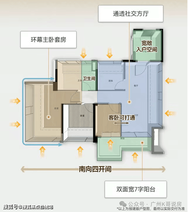 四开间朝南已经是基操了,卧室全部南向归置,厅房阳光景观平权。