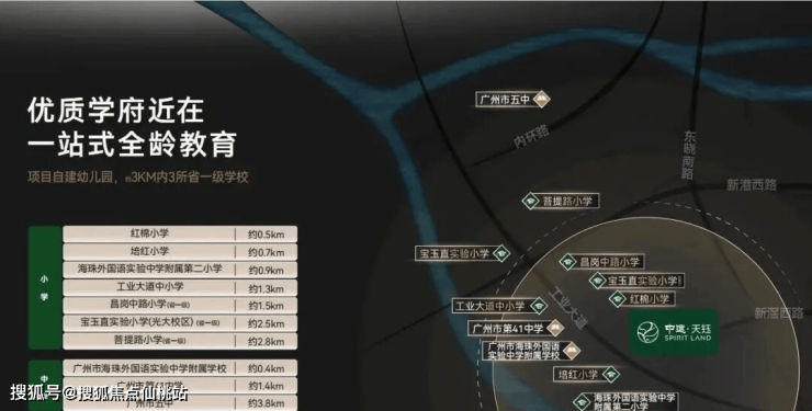 项目自带一所幼儿园,小学以上就要依赖周边,距离最近的公办小学是海珠区金碧第一小学(西校区)和海珠区石溪劬劳小学,两所小学对口初中分别在第五组和第七组