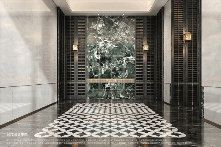 社区主入口采用酒店式落客区设计,进入小区前,必须穿过拥有高透外立面的归家大堂,约9米的挑高,竖向尺度上便拉满了酒店迎宾感