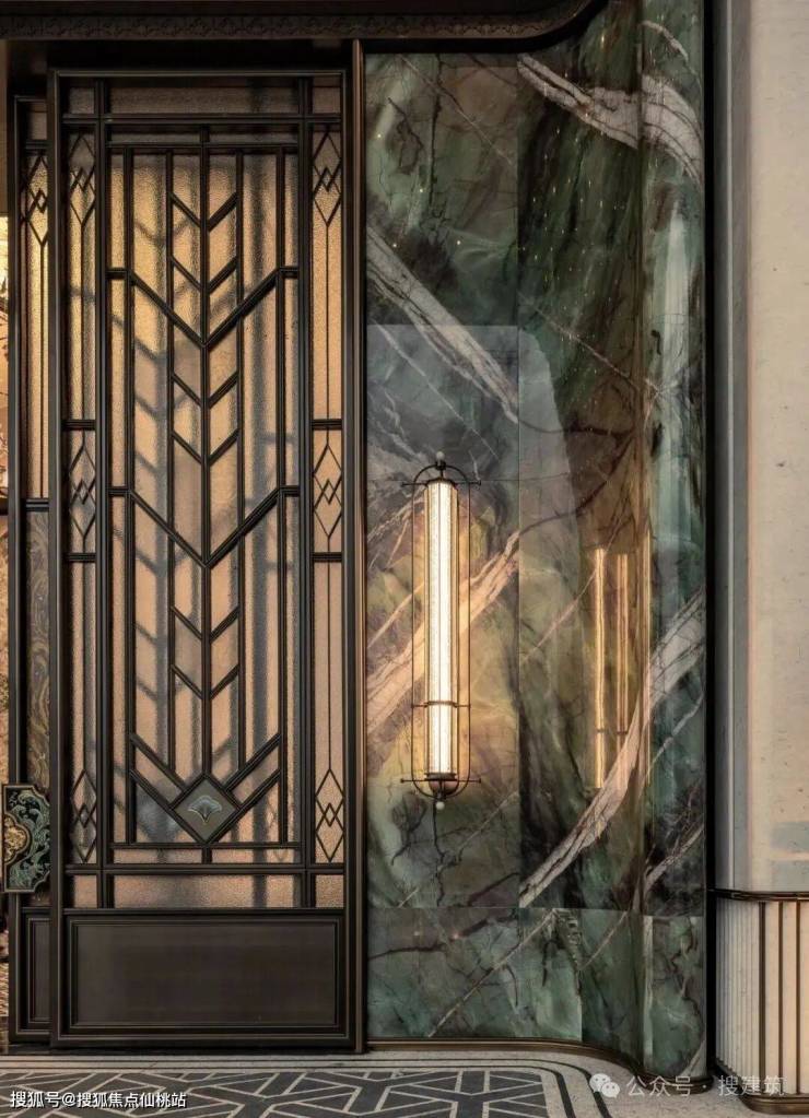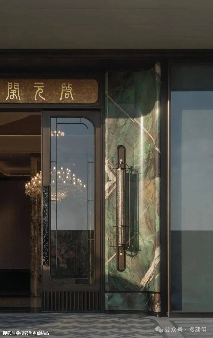 门扇上融入浪花琉璃玻元素,以简洁手法寓意外拓与进取,受厦门“海上花园”美誉启发,将海浪意象抽象化,呼应地域文化,契合社区开放包容氛围,玻璃晶莹质感与现代工艺为入口增添别致视觉效果。
