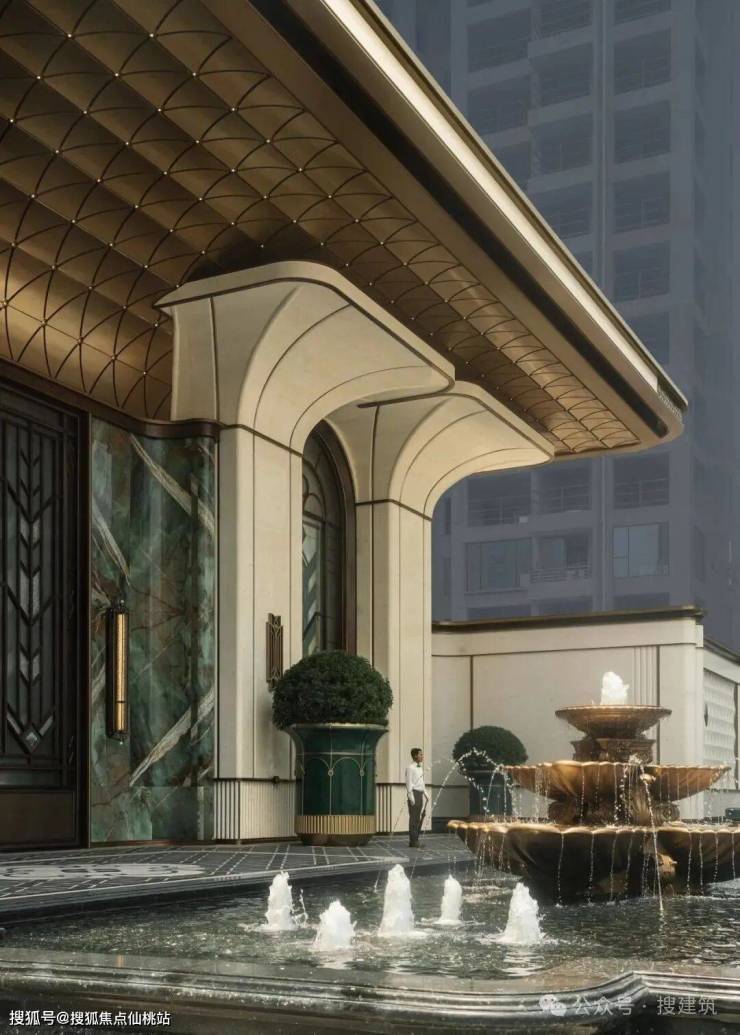社区西大门主体高12m,宽45m,当居住者穿过大门,空间的序列变化赋予归家过程强烈的仪式感,同时大尺度的设置也传递出豪宅应有的尊崇氛围。