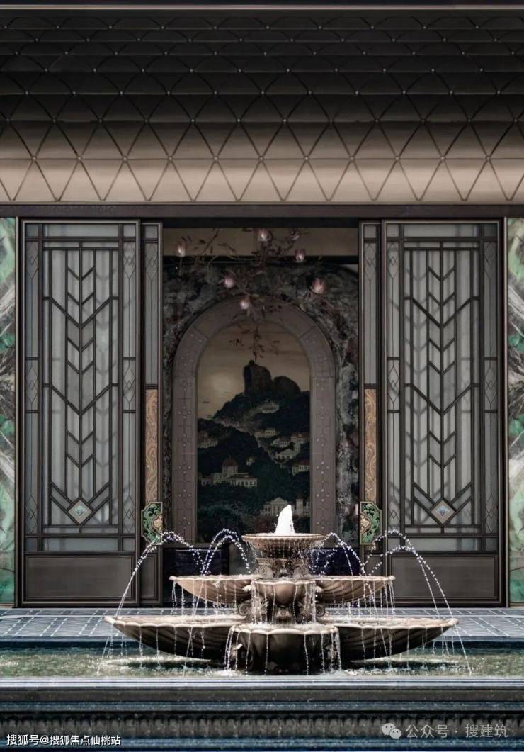 庭院空间采用创新的三重嵌套设计,精心构建出三种截然不同的情绪氛围。中心庭院的天花透光拼花窗格随日影变换,为在此交流的居民投射出斑斓光影,营造出梦幻而浪漫的氛围;凤凰廊架后方的紫藤花境,以自然植被打造出充满诗意的浪漫意境;而对称设计的狮头涌泉,则带来静谧而优雅的氛围,为居民提供一个宁静的休憩空间。