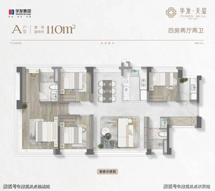 约110-114㎡四房两厅两卫:约16米通风面,户户是端户;约28㎡行政级端卧套房,270°景观视野,360°环统式采光