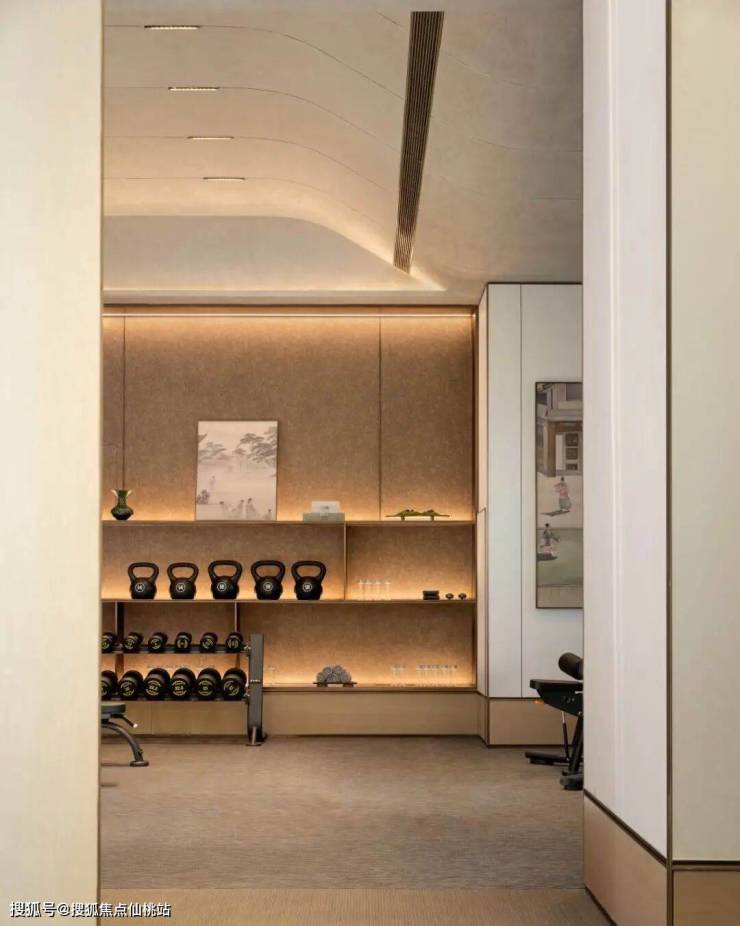 力量训练区墙面,以“裂纹汝瓷”为灵感,天蓝釉色如静水深流,北宋雅韵跃然眼前;有氧区地毯纹样提取“潮光潋滟”的层叠水波,器械排列似舟行水上,动感与诗意共生。空间材质选用石黑、古铜,硬朗肌理中点缀贝母光泽,如水中映月,刚柔并济。