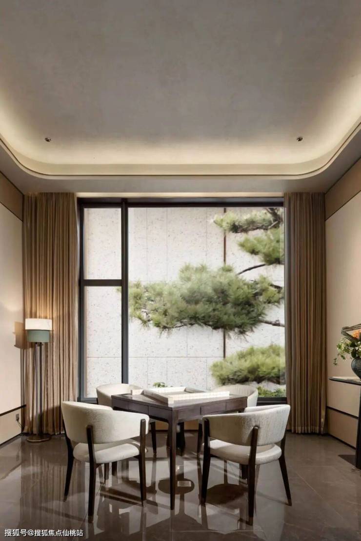 棋牌室水意流动,墙面画中波涛起伏,地面地毯水纹交互,山、水、竹相呼应,勾勒出生活的雅趣;茶室中可移动泡茶台,选用石黑与古铜榫接,桌面留白处嵌入一方青瓷茶盘,呼应“自保之美”的克制与矜贵。母婴室墙面饰以松树皮肌理,天然材质与暖光交融,于隐秘处传递“山水润物”的温柔。