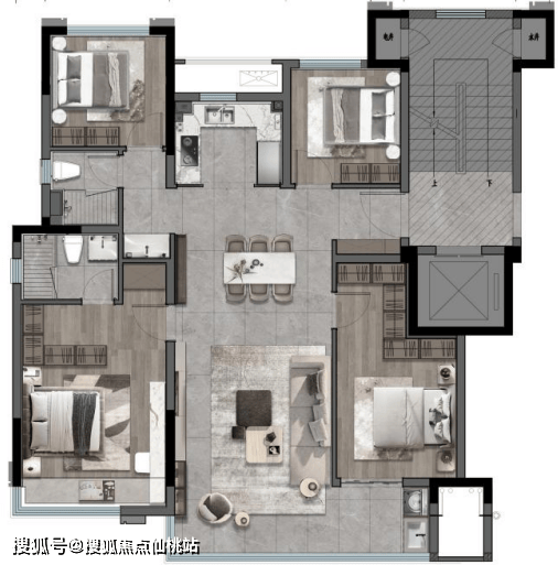 .主卧小家化:主卧4.8m大面宽开间尺度,拥有完整衣帽间及双台盆卫生间。