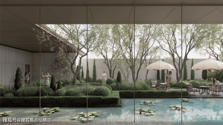 首创“城市屋檐”概念,结合社区阳台与屋顶花园,打造立体绿化体系;水院景观引入灵动水景,结合“三纵三横”艺术花园,形成动静相宜的生态空间。