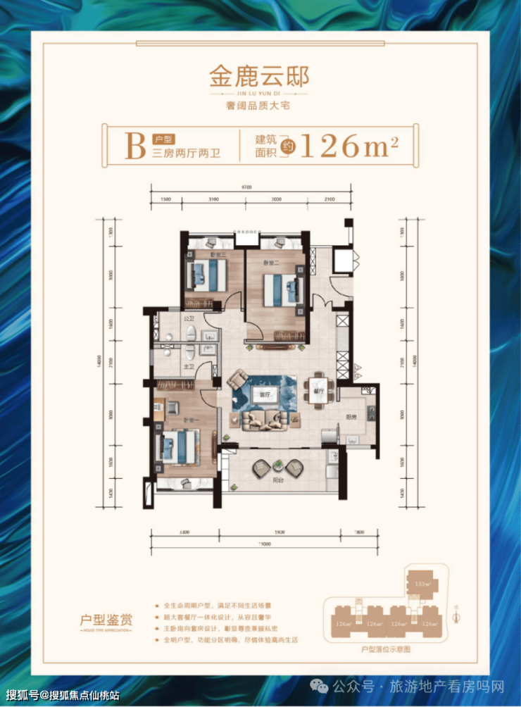 B户型:建筑面积126㎡,三房两厅两卫。户型方正,南北通透,奢华主卧南向套房设计,兼顾舒适性及私密性。