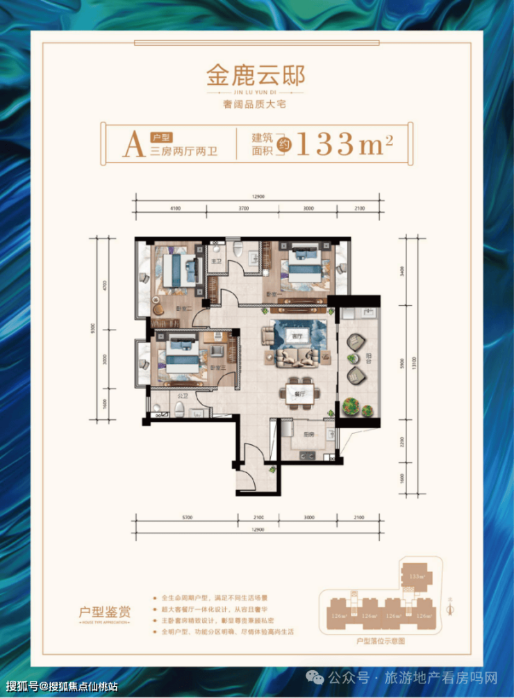 A户型:建筑面积133㎡,三房两厅两卫。全明户型,超大客餐厅一体化设计,功能分区明确。
