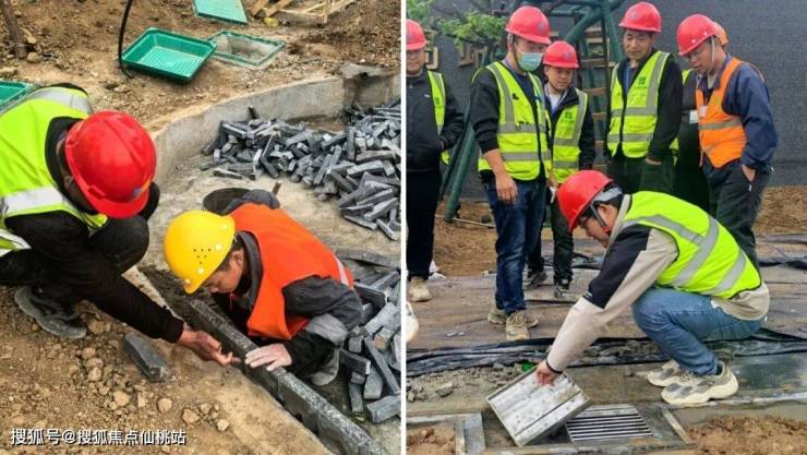 关于钢结构和铺装材料的选样,景观团队组织甲方和设计院经过反复推敲讨论,考量颜色、材质、纹理、规格、加工方式、工序衔接等综合因素,精选出满足要求的各类材料样品。为保证铺装横纵对缝、缝宽均匀、衔接自然的品质效果,景观团队根据“工艺匹配工匠”的思路,精选烟台、河北、四川等地优秀工匠开展各类特色铺装,利用“精细化排版”和“样板试铺”的前置方式,在大面积施工前做好工艺工序和质量标准的技术交底工作。