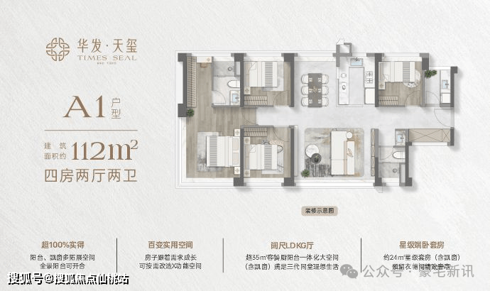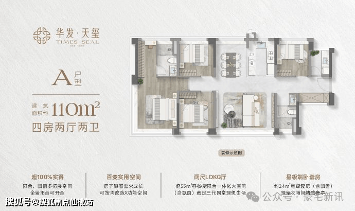 约110㎡四房两厅两卫:约16米通风面,户户是端户;约28㎡行政级端卧套房,270°景观视野,360°环统式采光