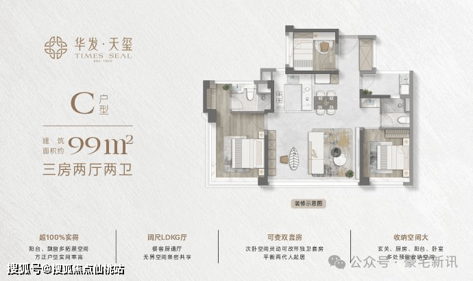 约99㎡3+1房两厅两卫:约35㎡LDKB厅餐客一体化设计,可变双套房;270°无遮挡视野,室内空间通透