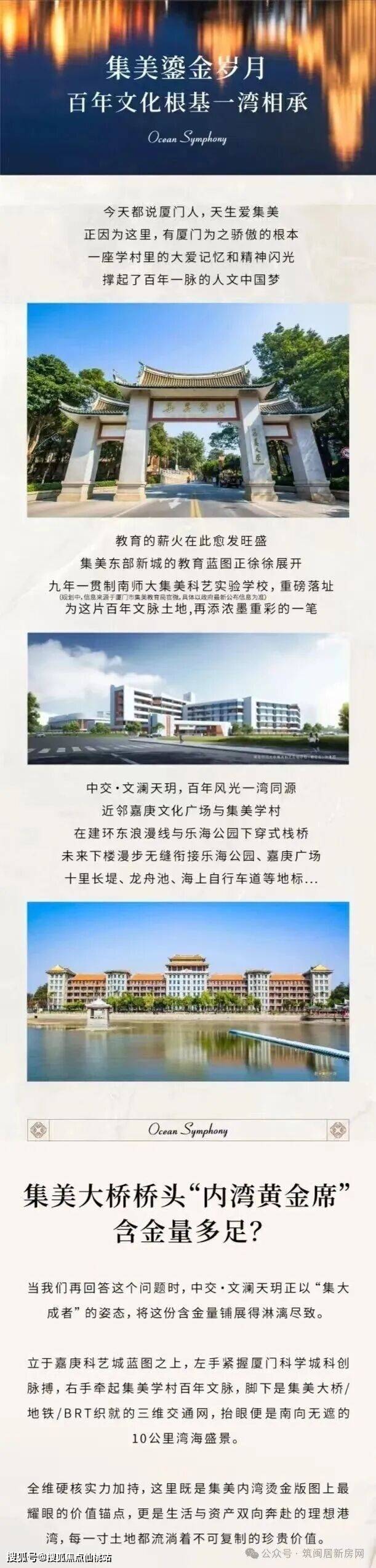 稀缺景观资源:占据集美“最后湾海景观眼”,部分户型推窗见海。中交文澜天玥A1、A3地块全系都是4房以上户型,整个厦门都罕见;125和143平,4房3卫双套卧首现厦门,非常震撼!特别是A3地块,将带来厦门第二大、岛外最大的约3000平下沉式会所,是岛外其它盘的两倍面积,又是海派南洋风格,作为集美首个高端改善产品,占据集美桥头堡位置,地铁,学校,产业,商场,一桥之隔到五缘湾