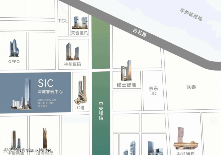 “一心双核”:十字交汇处,三栋高层建筑环绕交通枢纽形成势能强大的超级湾心;深湾云城都市核心、滨海门户文化核心代言城市形象。
