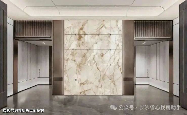 酒店式精妆双大堂设计,挑高敞阔格局,引入造型背景墙,金属与石材结合,点滴之间皆为金茂匠心。专属电梯厅,高规格入户仪式。