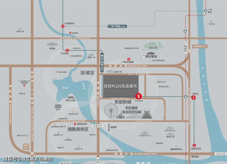 于顺德主城而言,真正的「黄金三角圈」,其实就在大良欢乐海岸周边约1公里范围内,也就是顺控PLUS·凤语潮鸣所处地段。