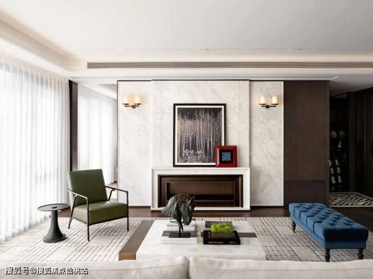 墙面大理石背景墙嵌着极简壁炉,两侧壁灯暖光漫开,搭配黑白林景艺术画,既藏着宋画的意境留白,又有现代空间的利落质感,让阔境空间真正服务于生活的每一种场景。