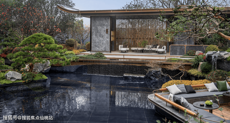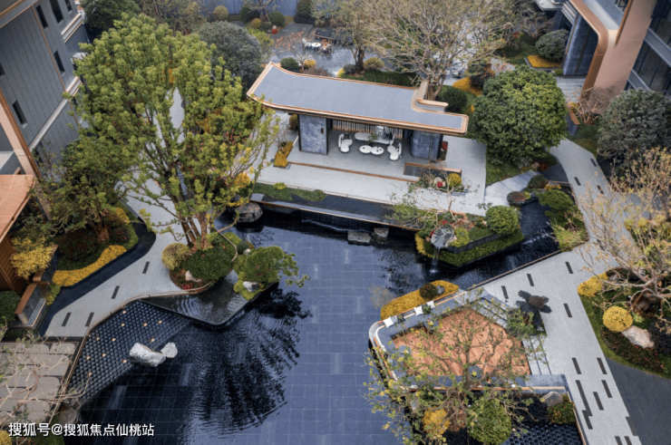 整个园林采用围合式布局,拥有“七大主题组团与四大功能空间”,其中,中庭景观园林约3300㎡,采用对景、借景、框景、障景的造园手法运用,营造出沉浸式的酒店式度假秘境。