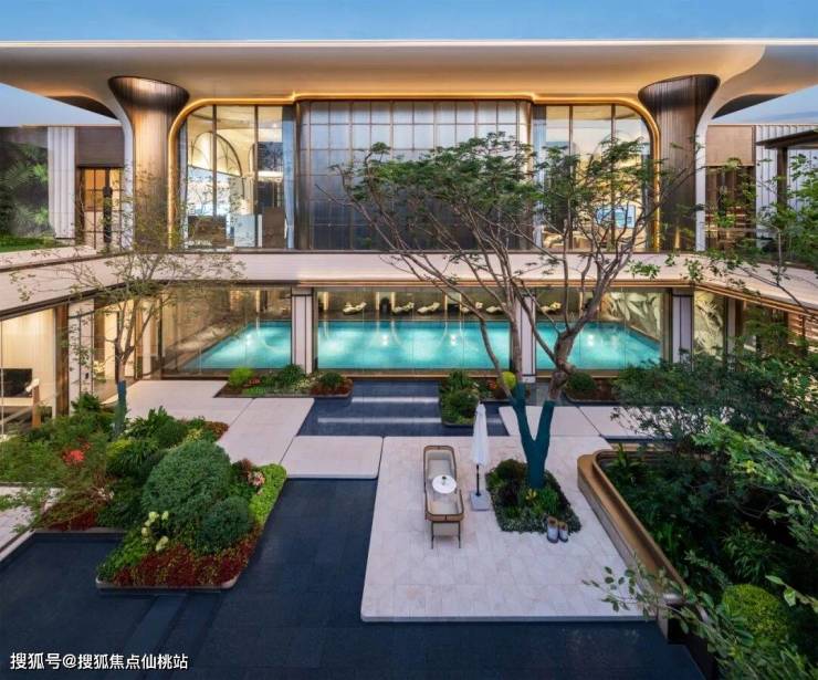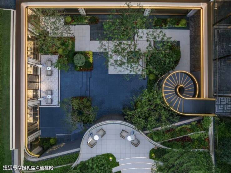 下沉庭院是一处南洋海派风情花园,老桩凤凰木、庵摩勒、丛生乌桕等名贵树种随处可见,核心景观树更是采用从上千棵树木中臻选的凤凰木。